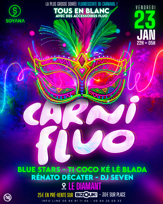 SOYANA et RED BY SFR sont heureux de vous présenter leur soirée CARNIFLUO avec LES BLUE STARS, RENATO DECATER et TI COCO KE LE BLADA, le vendredi 23 janvier 2026 dès 22h au Diamant.