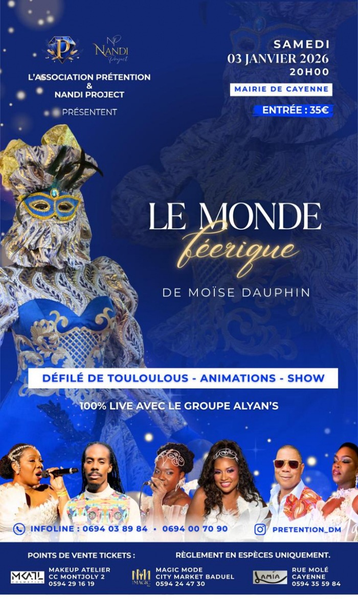 L'association Prétention et Nandi Project présentent Le Monde Féerique de Moïse Dauphin", le samedi 3 janvier 2026 dès 2Oh à la Mairie de Cayenne.
