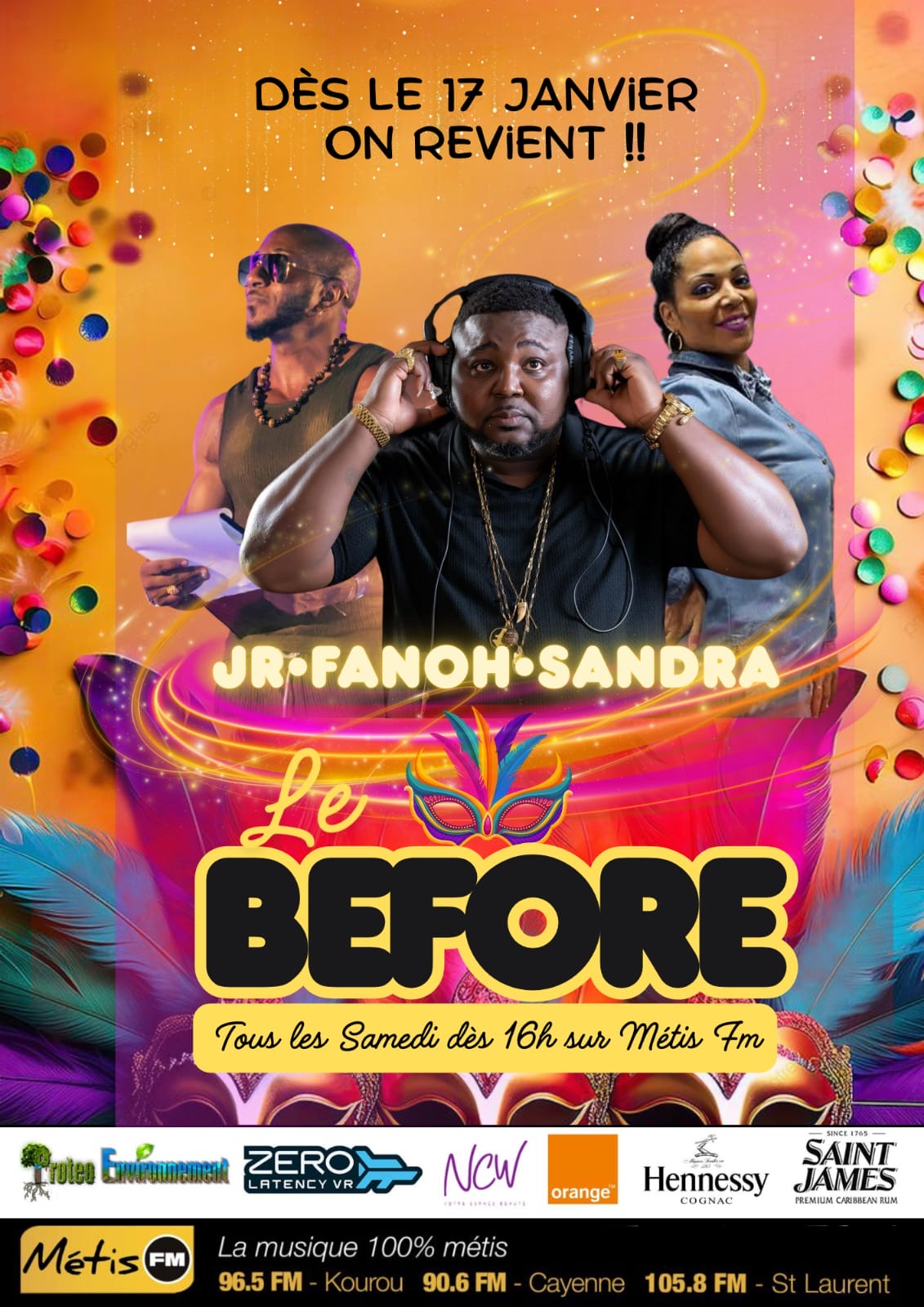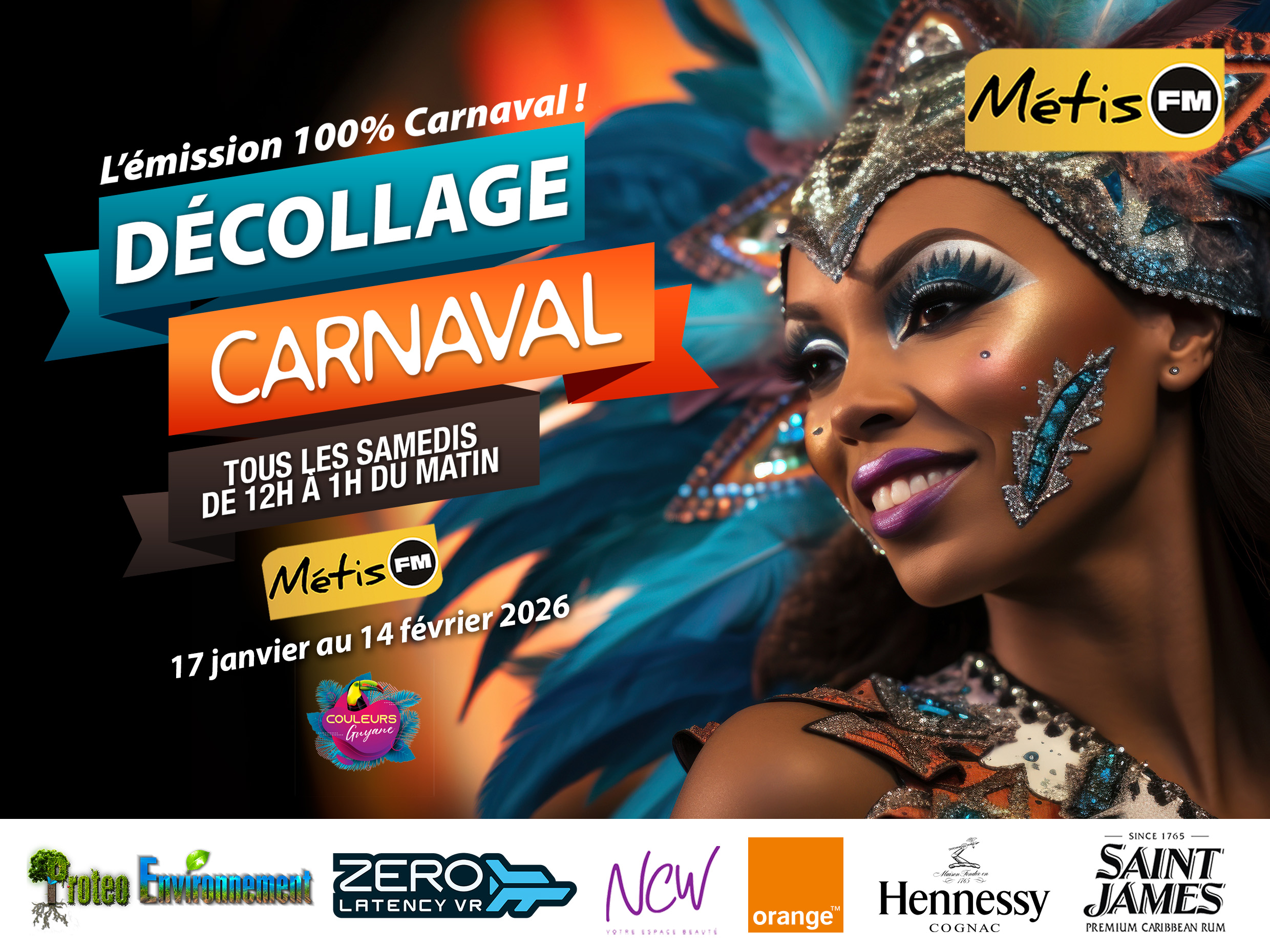 Retour de votre émission 100% Carnaval, Décollage Carnaval, tous les samedis de 12h à 1h, du 17 Janvier au 14 Février 2026 sur Métis. De 16h à 20h, Retrouvez l’équipe du Before, composé de JR, FAN’OH et SANDRA pour des jeux, cadeaux, Kozés Chos, artistes invités et des orchestres en live dont les dates vous seront communiquées. Décollage Carnaval, avec la participation de Couleurs Guyane, Proteo Environement, Zero Latency, New Cosmetics World, Orange, Hennessy et le rhum Saint James à consommer avec modération.