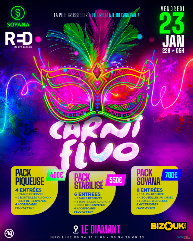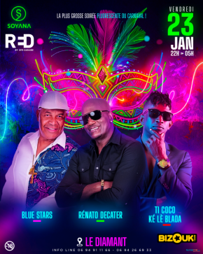 SOYANA et RED BY SFR sont heureux de vous présenter leur soirée CARNIFLUO avec LES BLUE STARS, RENATO DECATER et TI COCO KE LE BLADA, le vendredi 23 janvier 2026 dès 22h au Diamant.